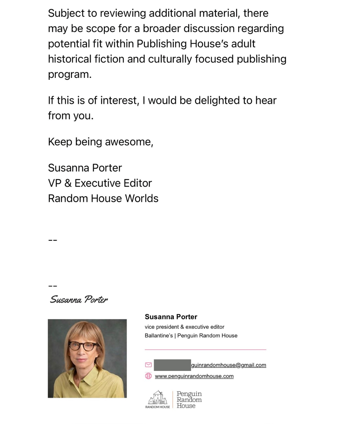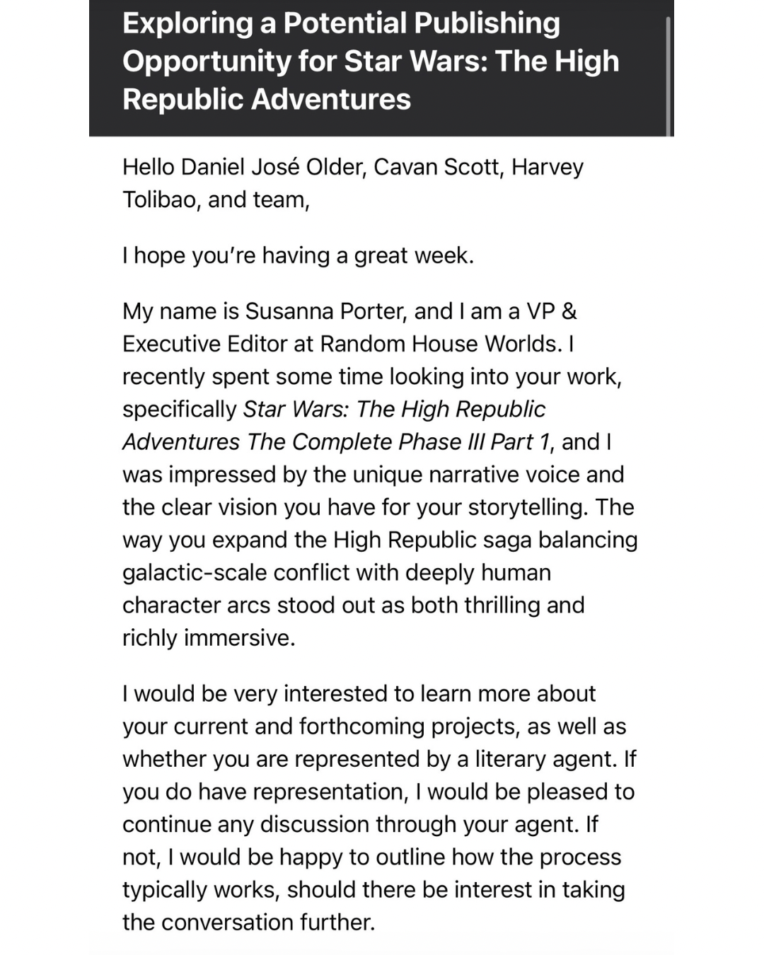 Of course there are SO many red flags in that email. Why would a Star Wars all-ages graphic novel be of interest to someone curating an adult historic fiction line? Why wouldn’t PRH be all over Star Wars: The High Republic, an initiative they’ve been a part of since the very beginning? Why is someone at PRH be using Gmail?