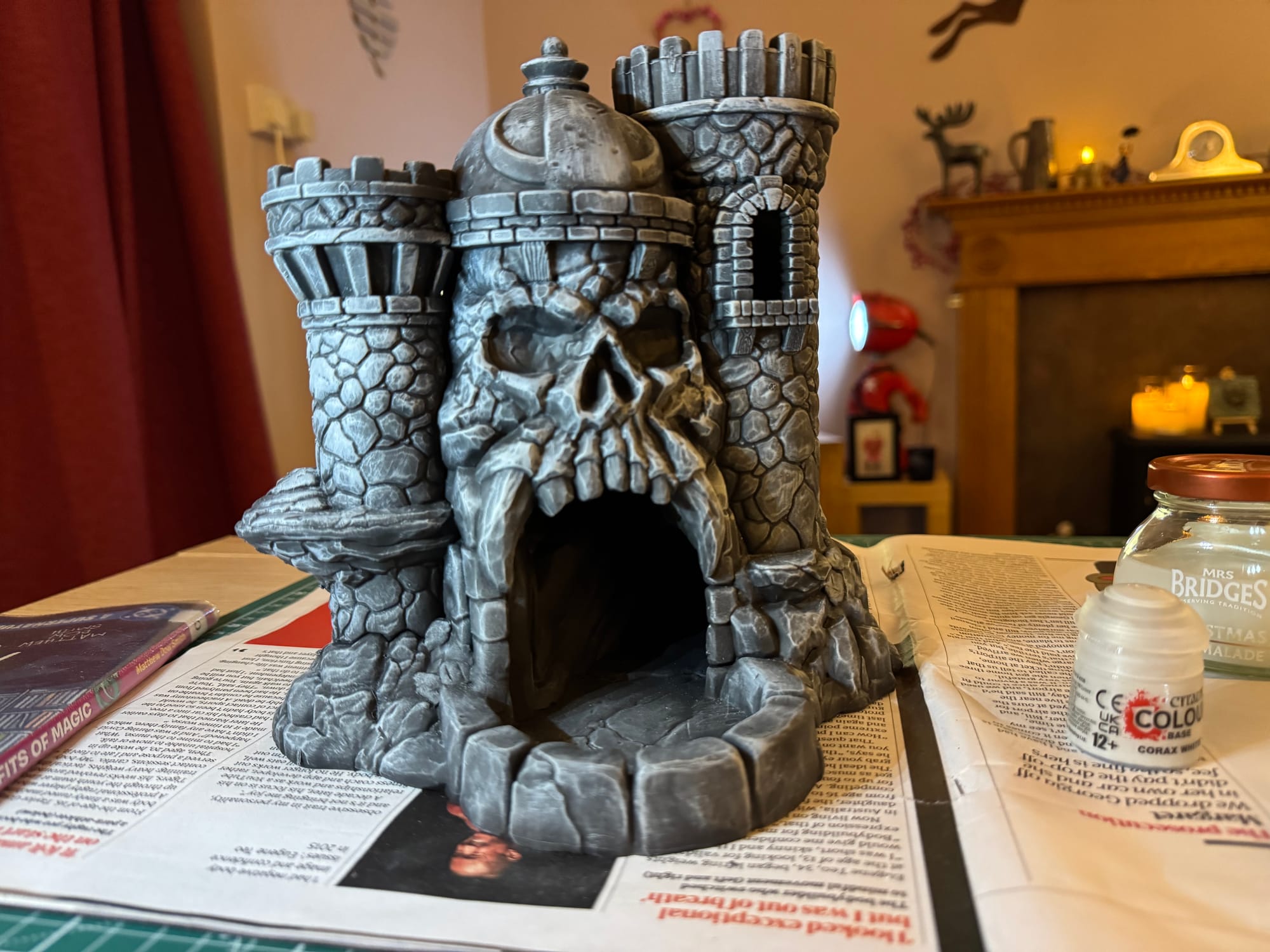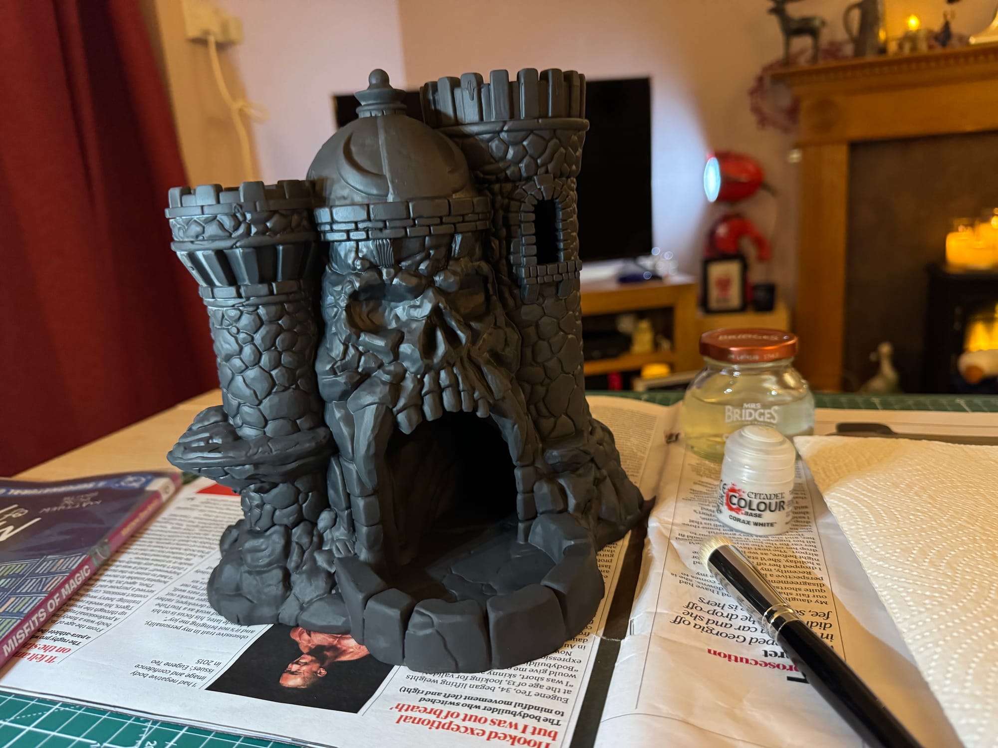 Then it was the turn of some watered-down Blood Angel Red from Citadel (lent to me by George Mann) to add a little flash to the eye sockets, along with dabs of Army Painter’s Dark Tone wash around the base to darken the rocks at the bottom of the castle.