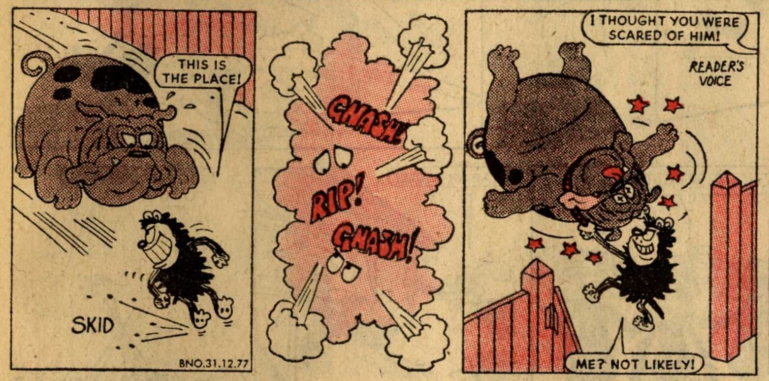Then comes Gwen’s fourth-wall-breaking antics. Growing up in Britain in the 70s and 80s we had a raft of weekly humour comics: the Beano, the Dandy, Whizzer and Chips, Nutty… the list went on and on. And those comics had a long-standing tradition of the characters talking directly to the reader and – more often than not – the reader talking back. All of these characters knew they were in comics, a tradition I was pleased to continue when I later wrote many of them in the Beano myself.