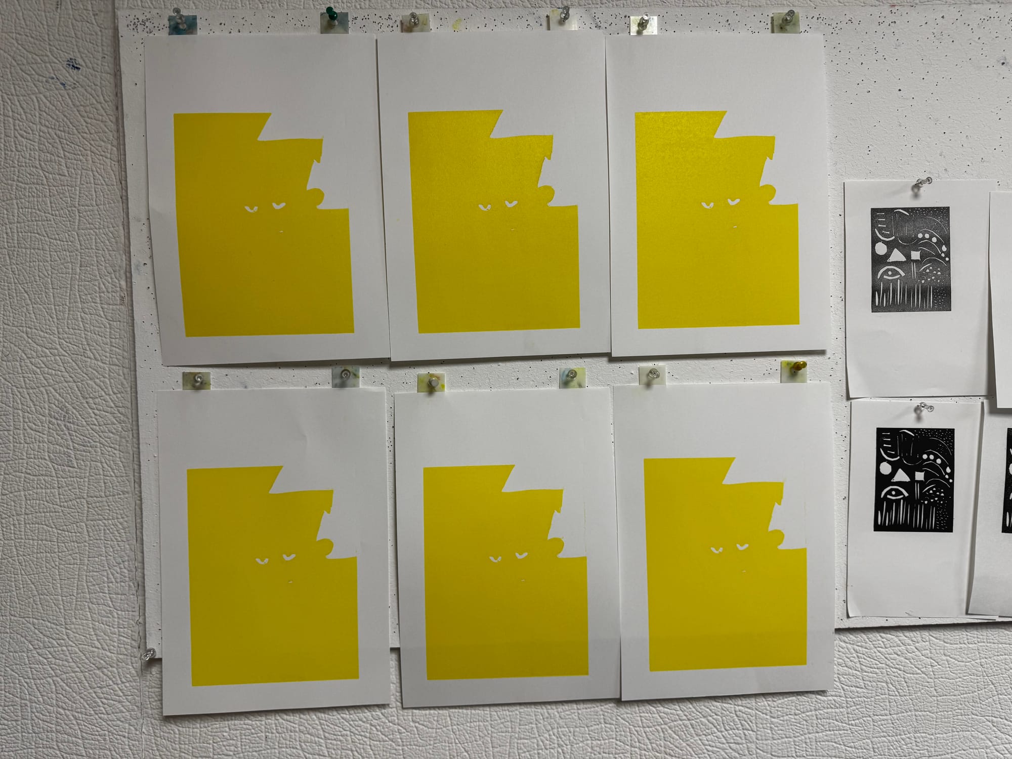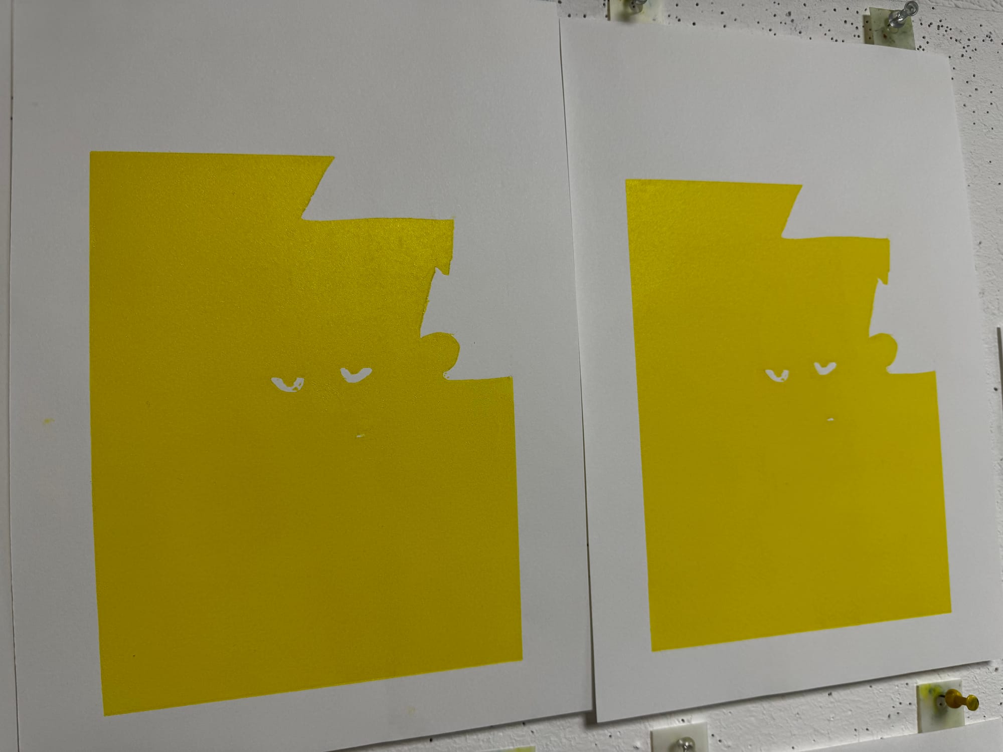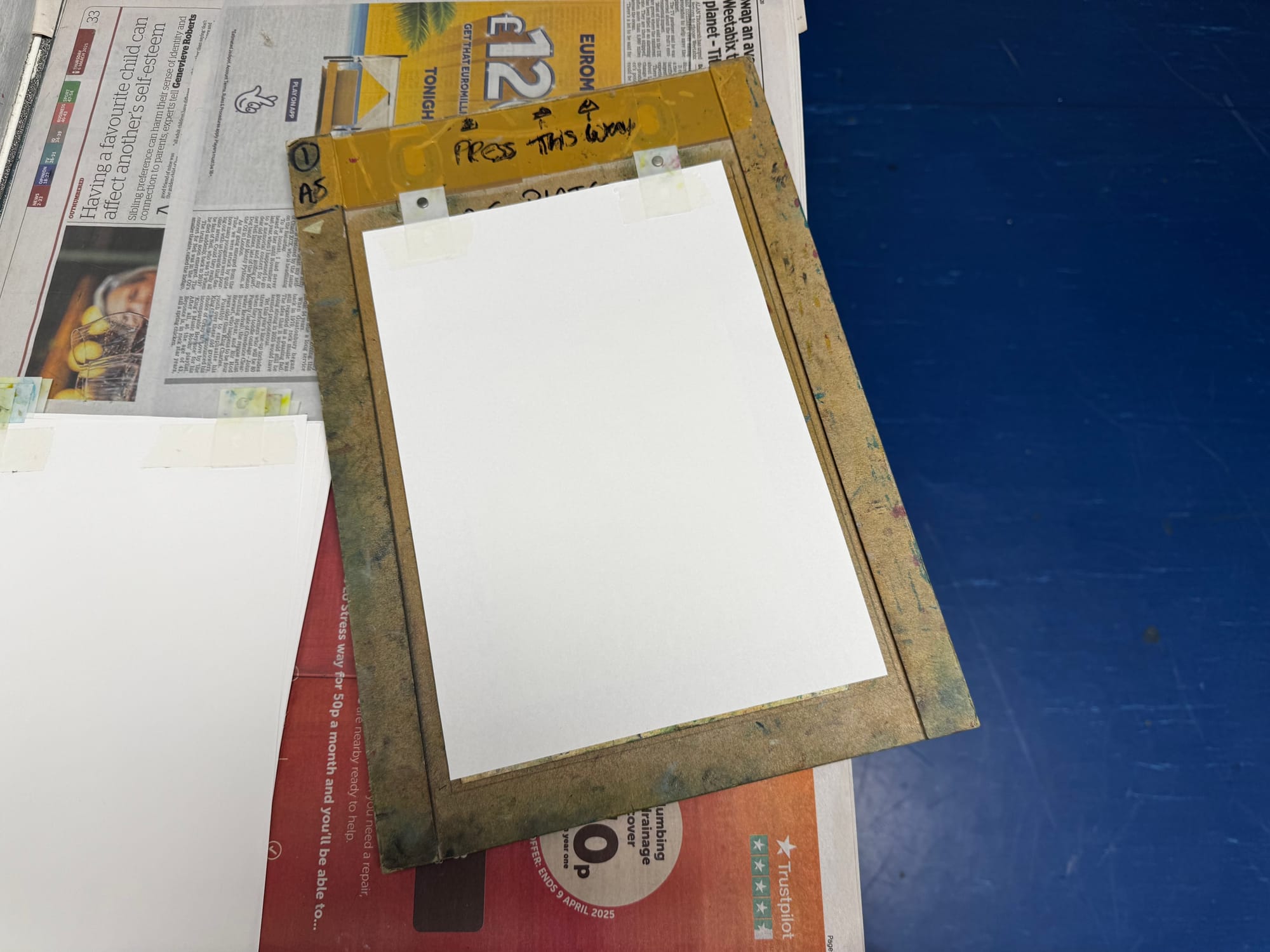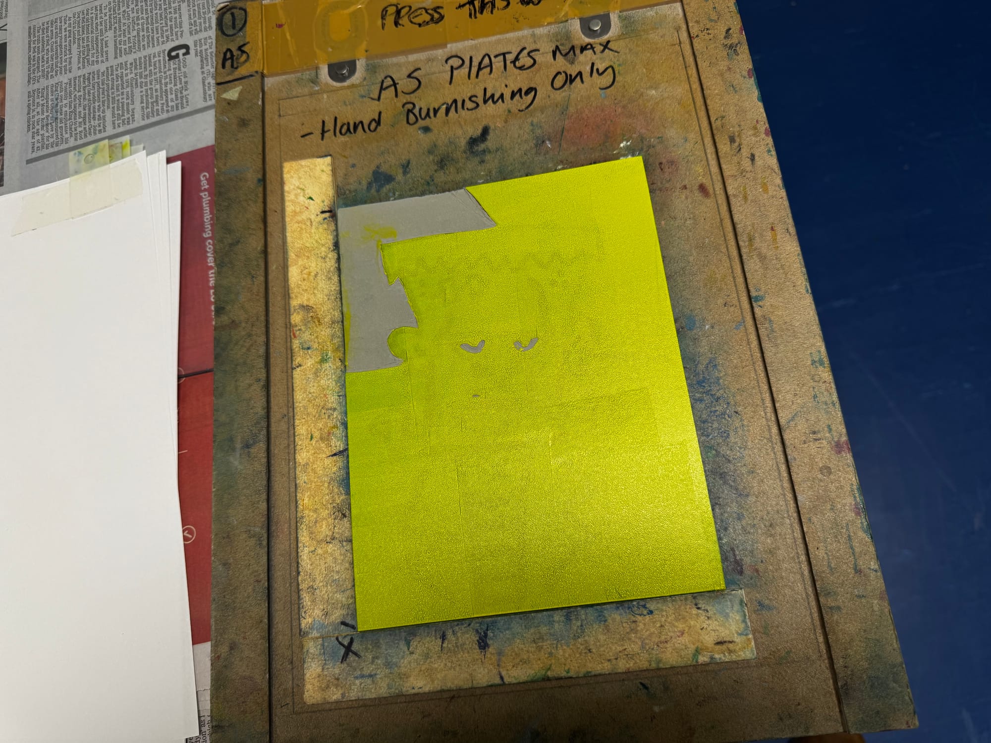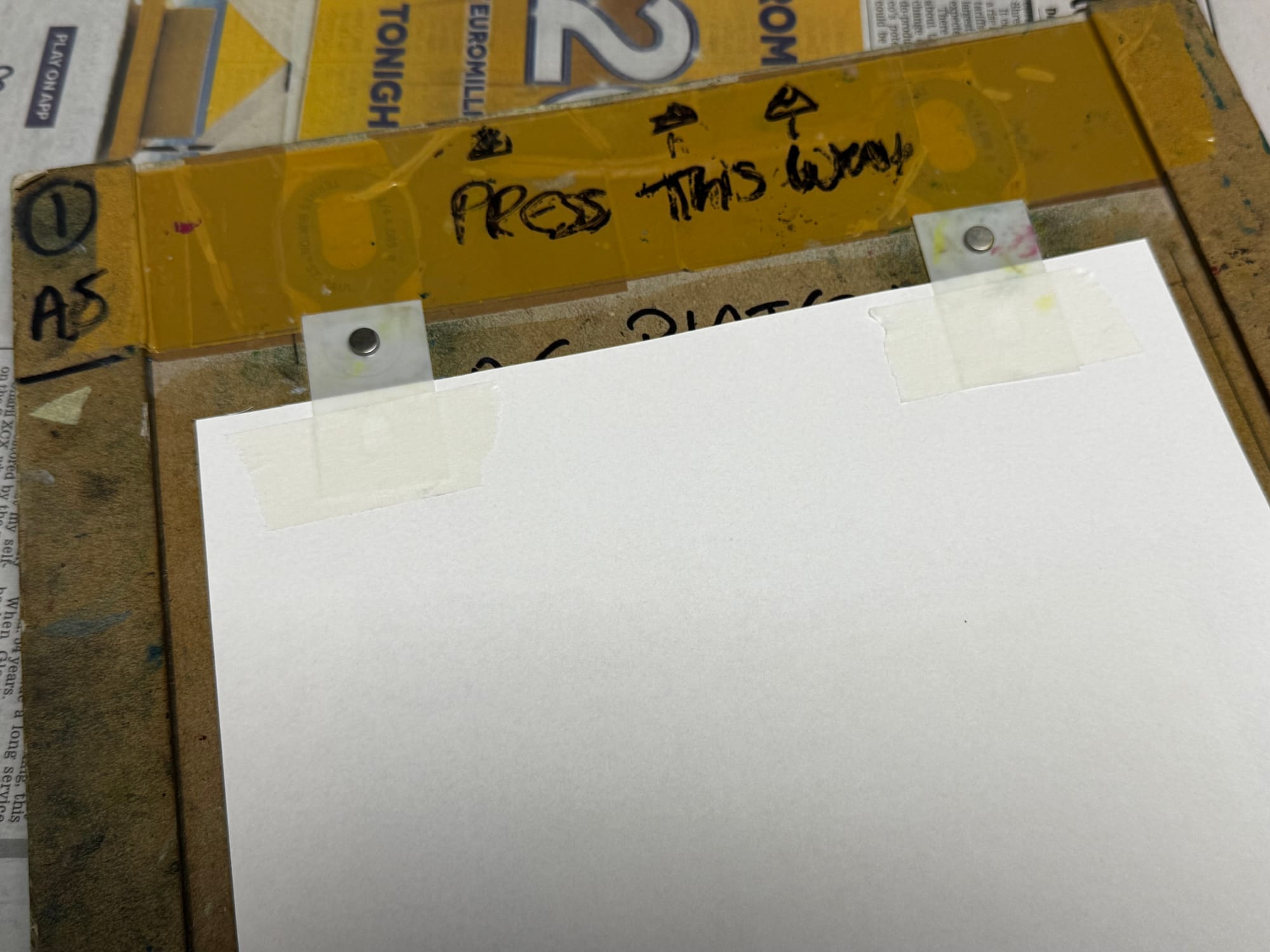 Those tabs keep the paper in the same place for all four prints. You line 'em up on the pins and – snap – everything should be cushty as long as the inked lino always rests in the same position, with the bottom left-hand corner pointing towards the X!
