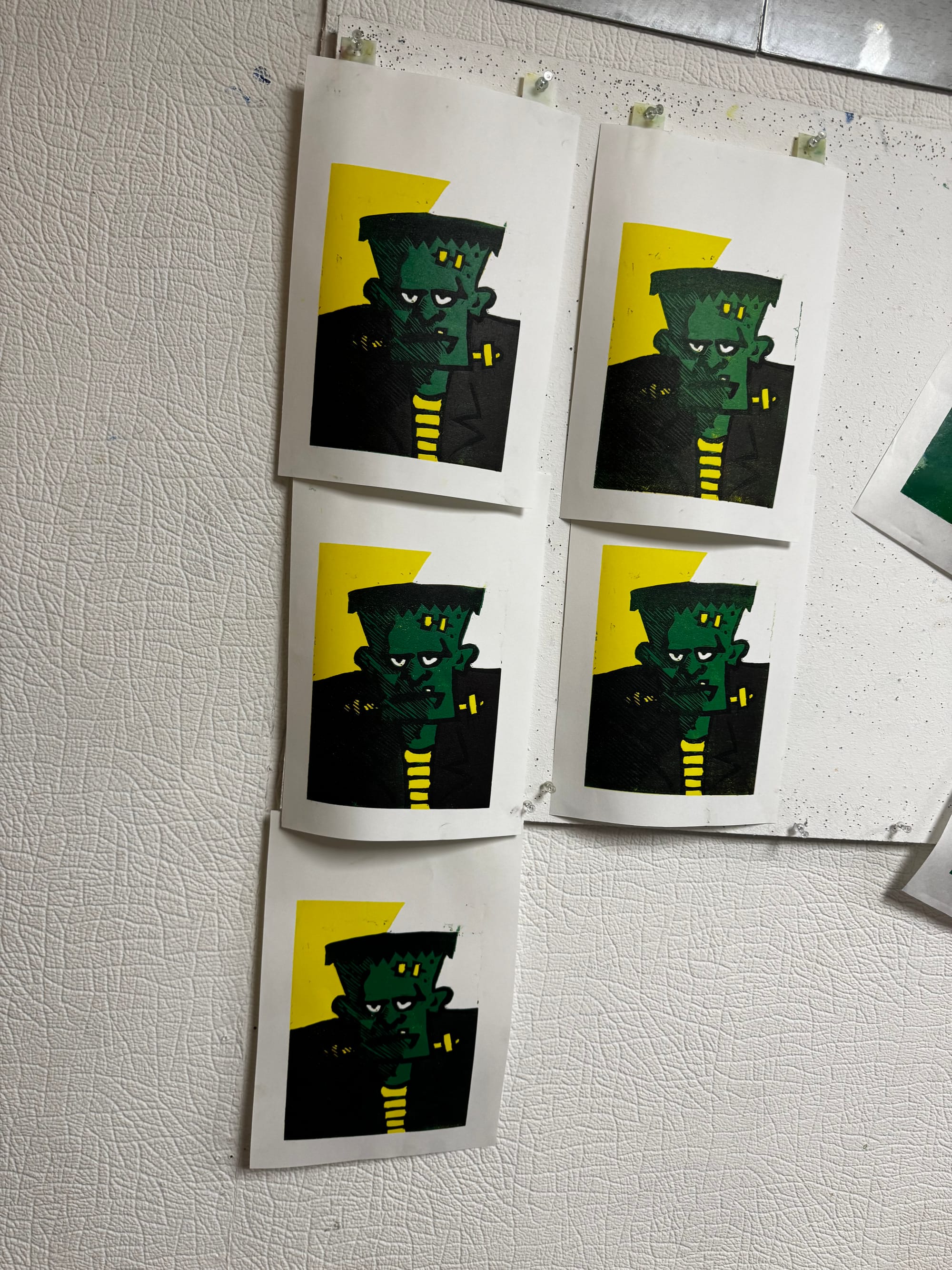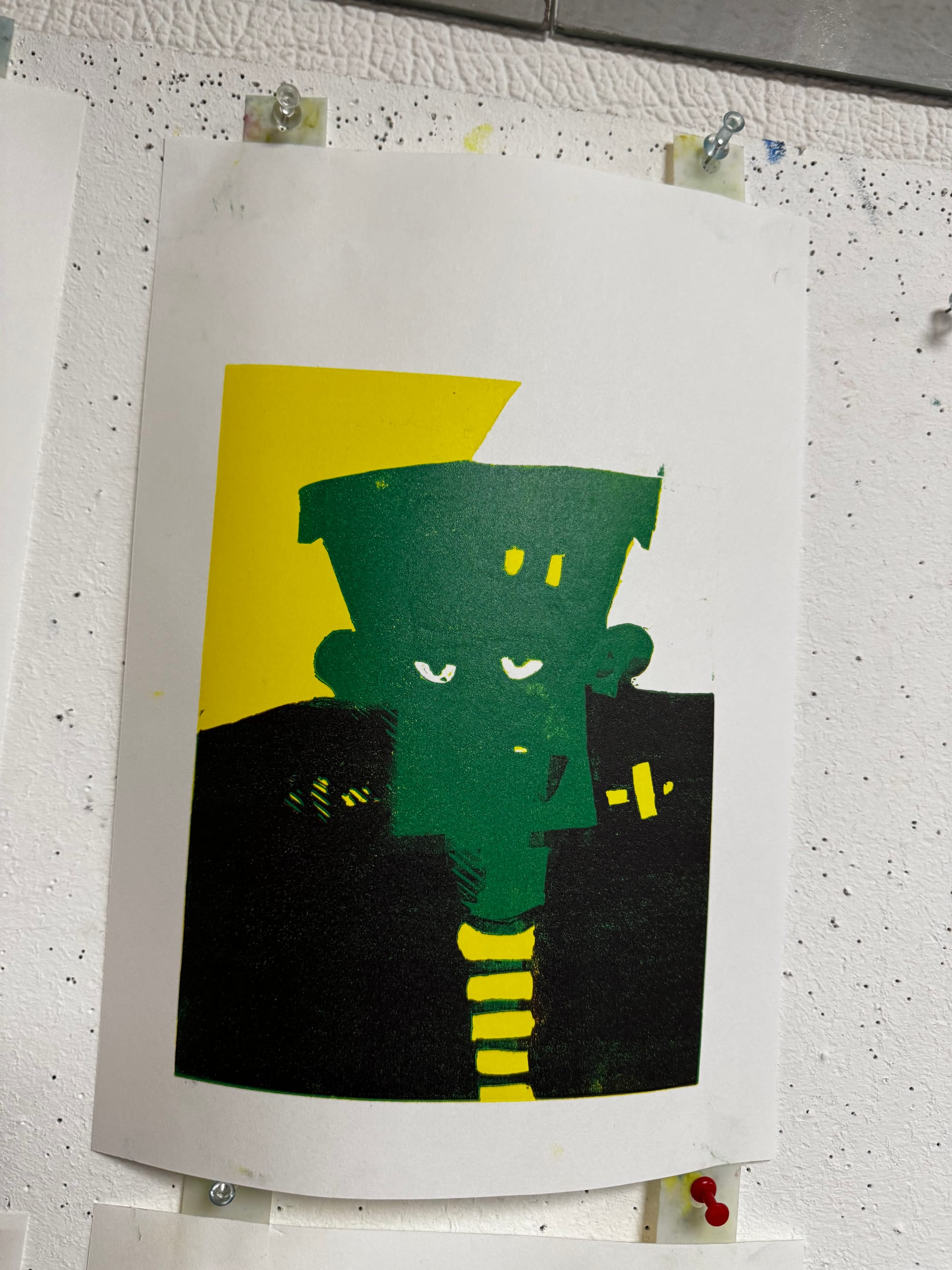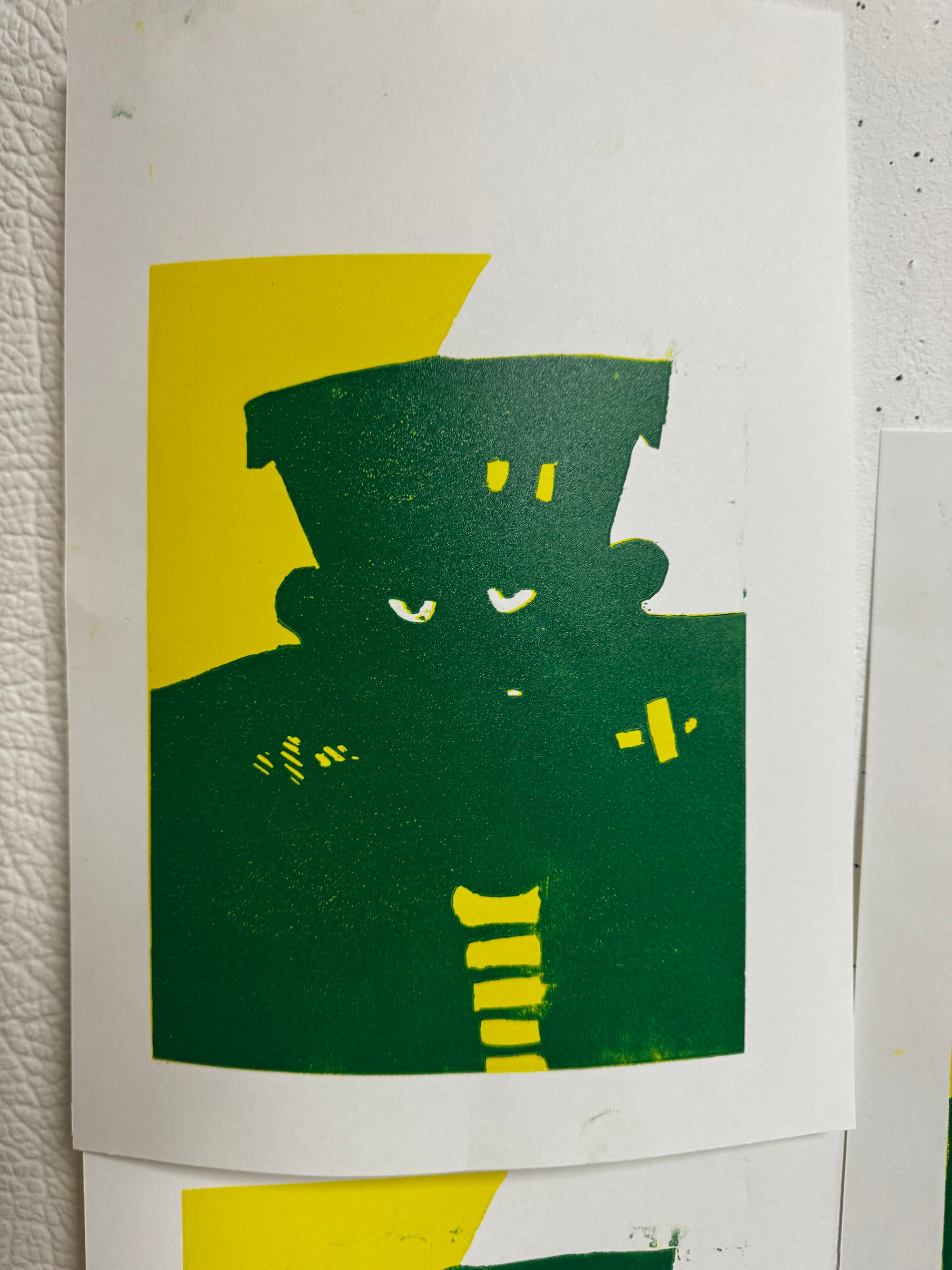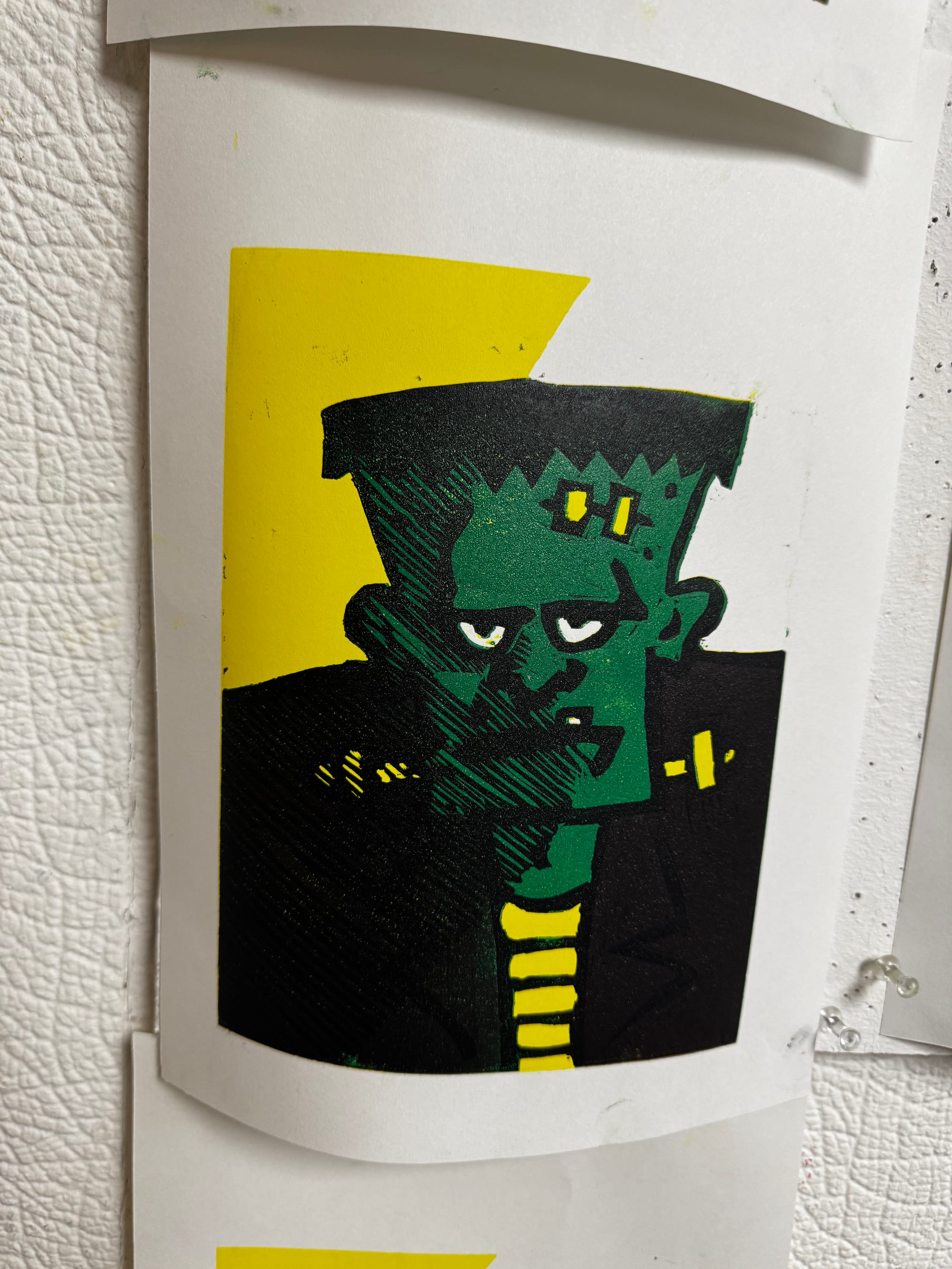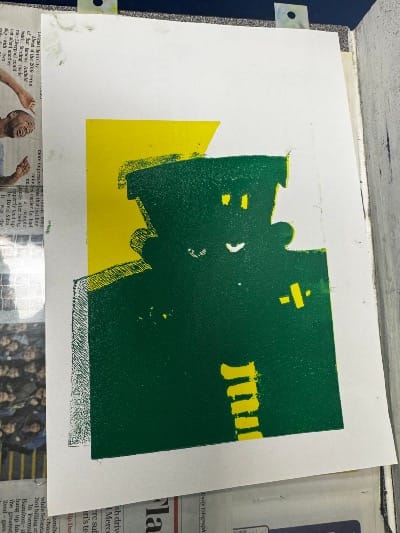It's where a single block is gradually carved away with each new layer of colour, building a multi-coloured image print by print. My instructor, Kerry, has been trying to get me to try a proper reduction for ages, so I took the plunge with a monster for Halloween.