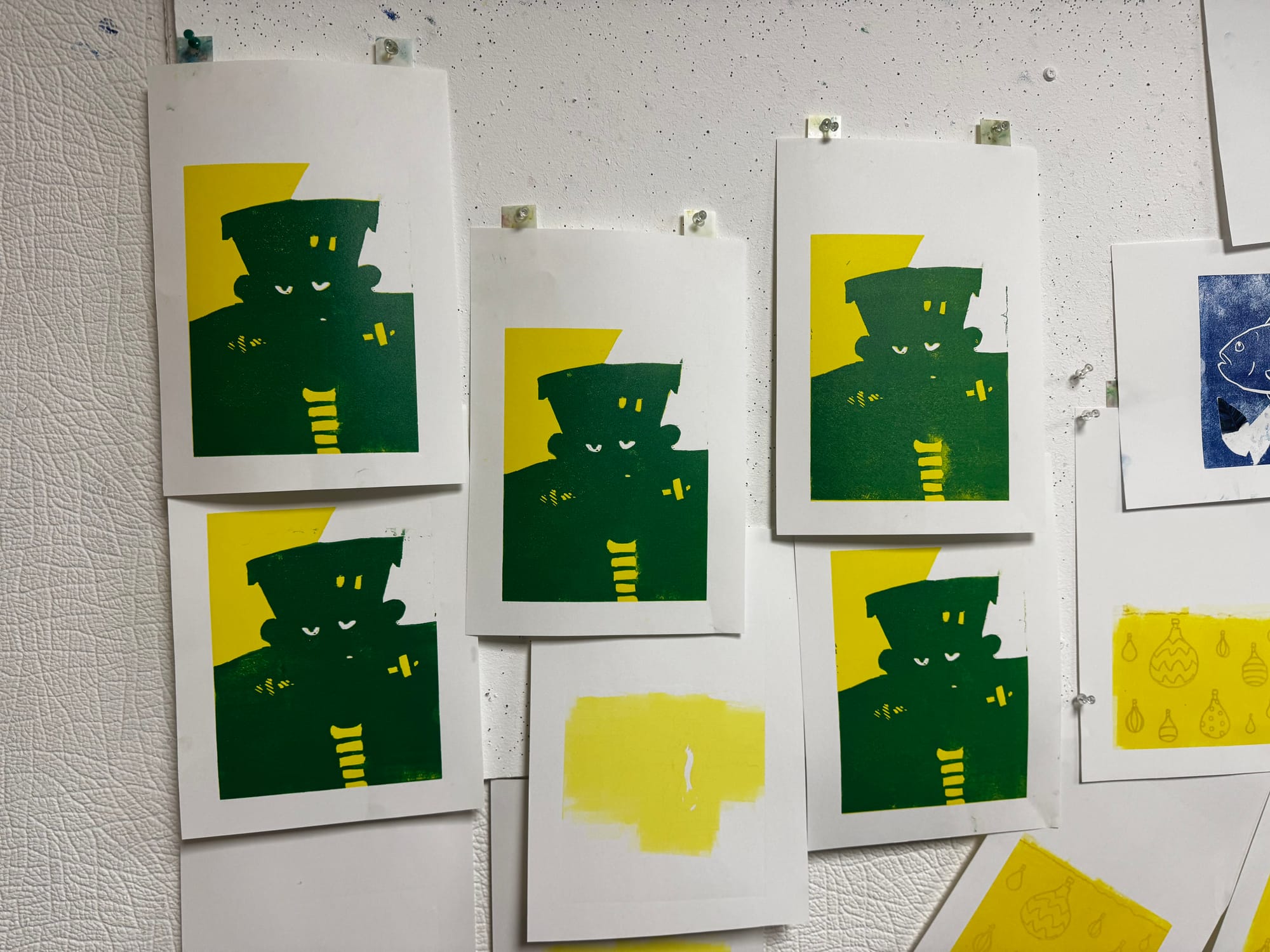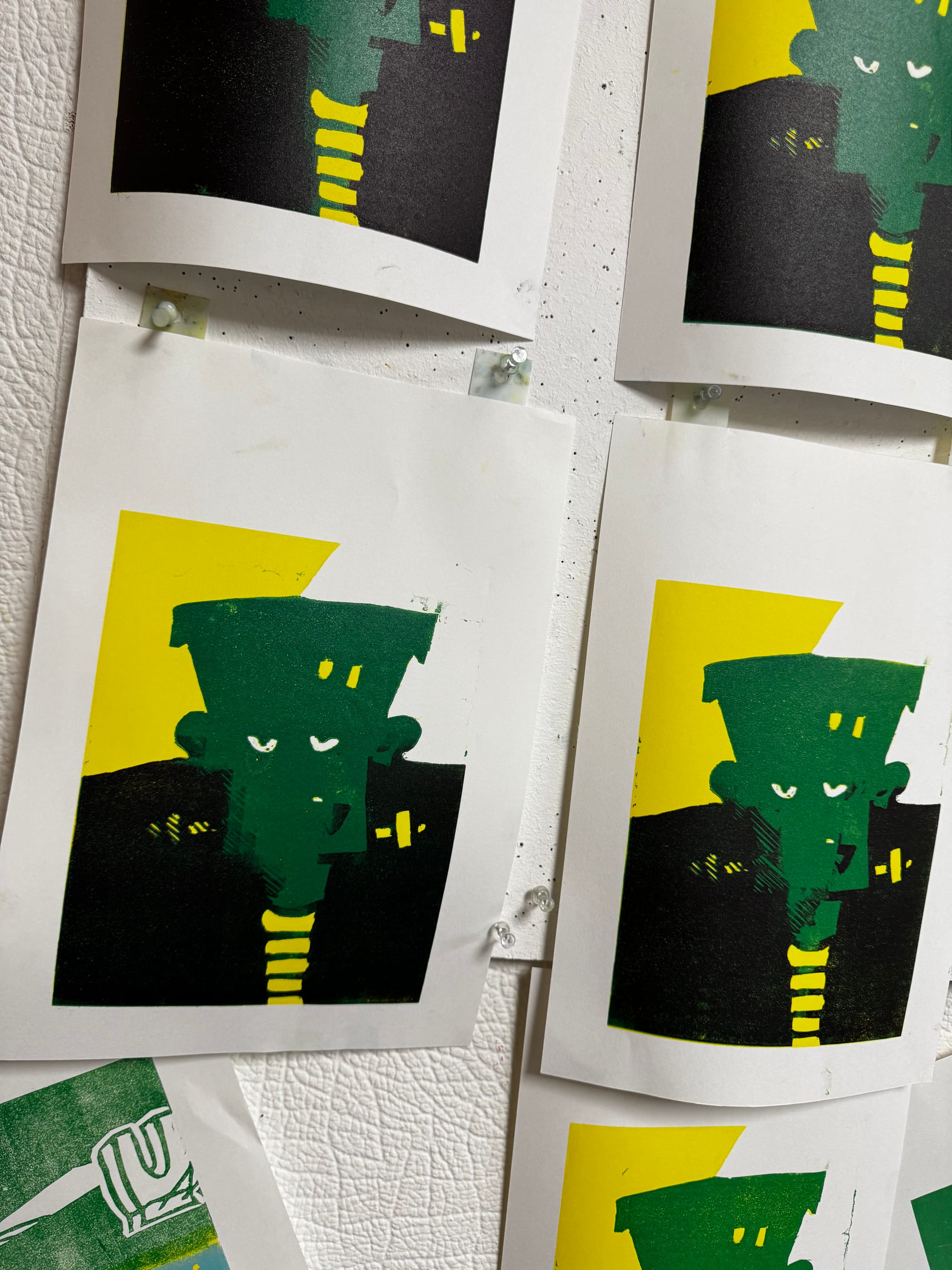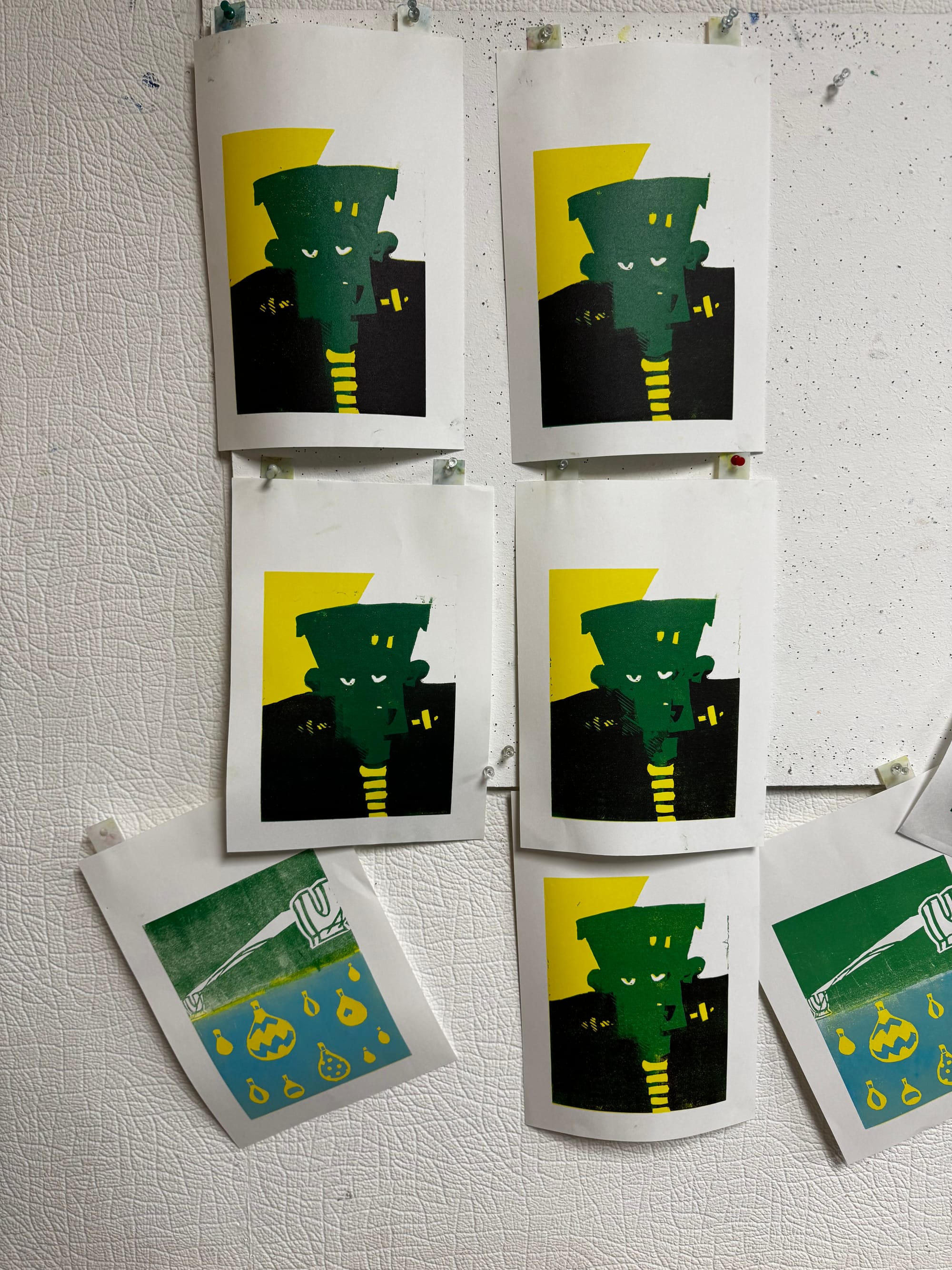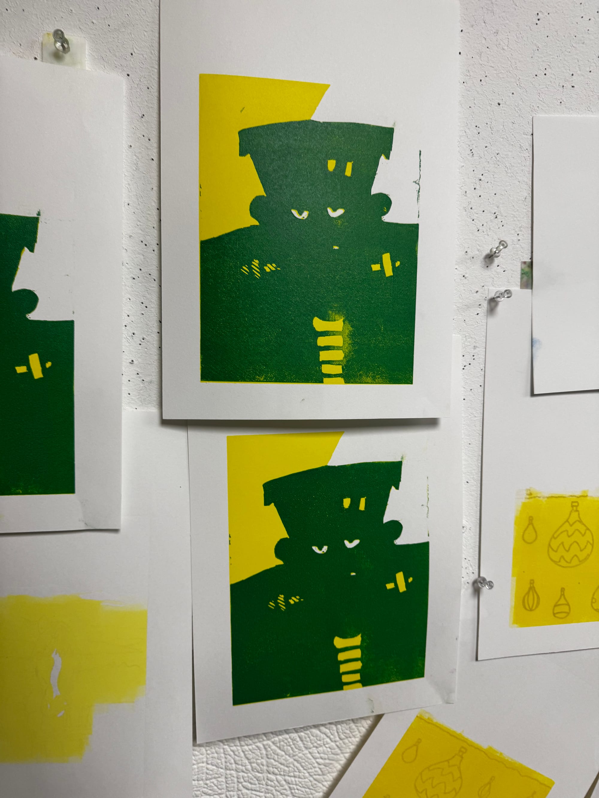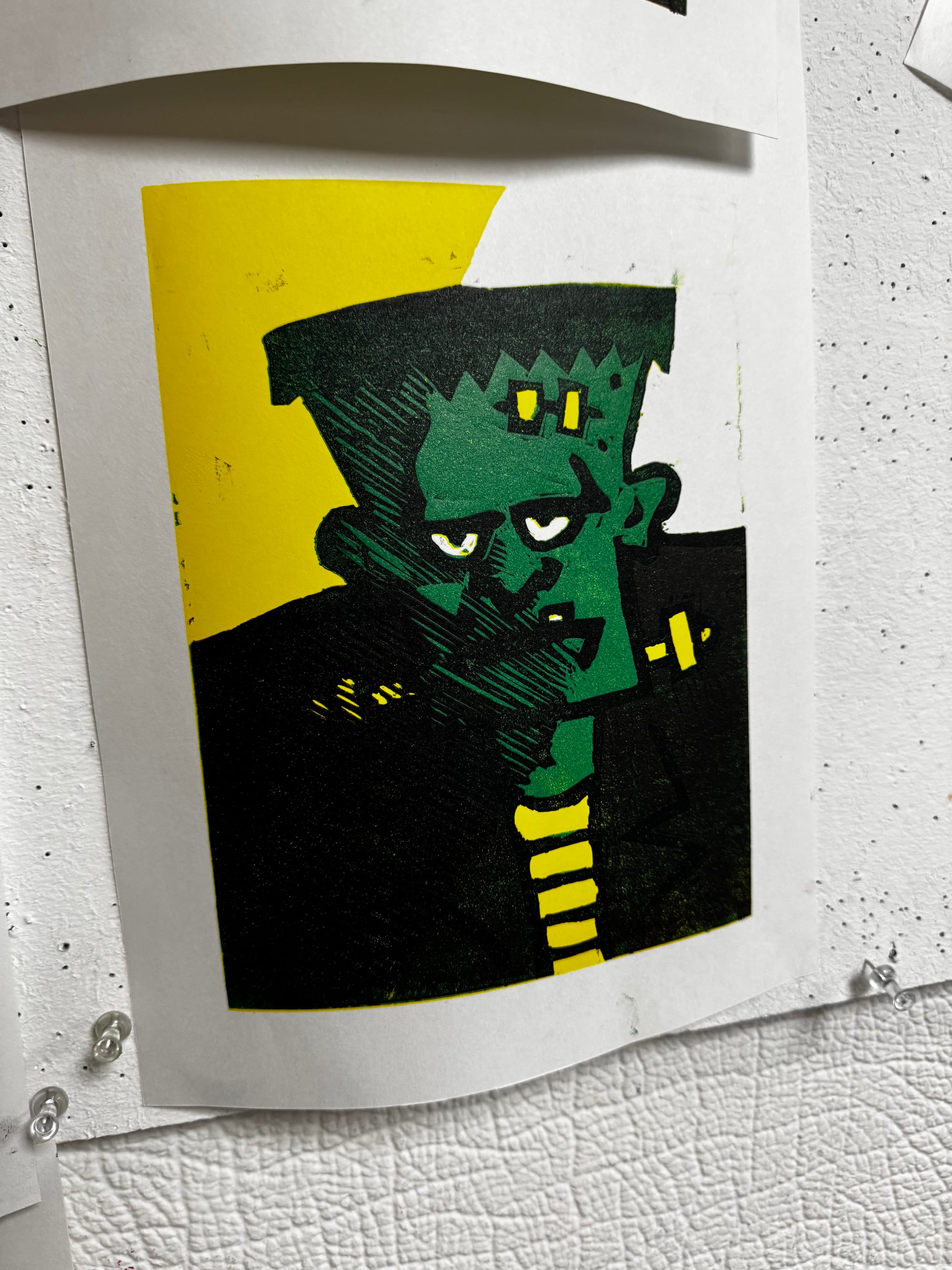It's where a single block is gradually carved away with each new layer of colour, building a multi-coloured image print by print. My instructor, Kerry, has been trying to get me to try a proper reduction for ages, so I took the plunge with a monster for Halloween.