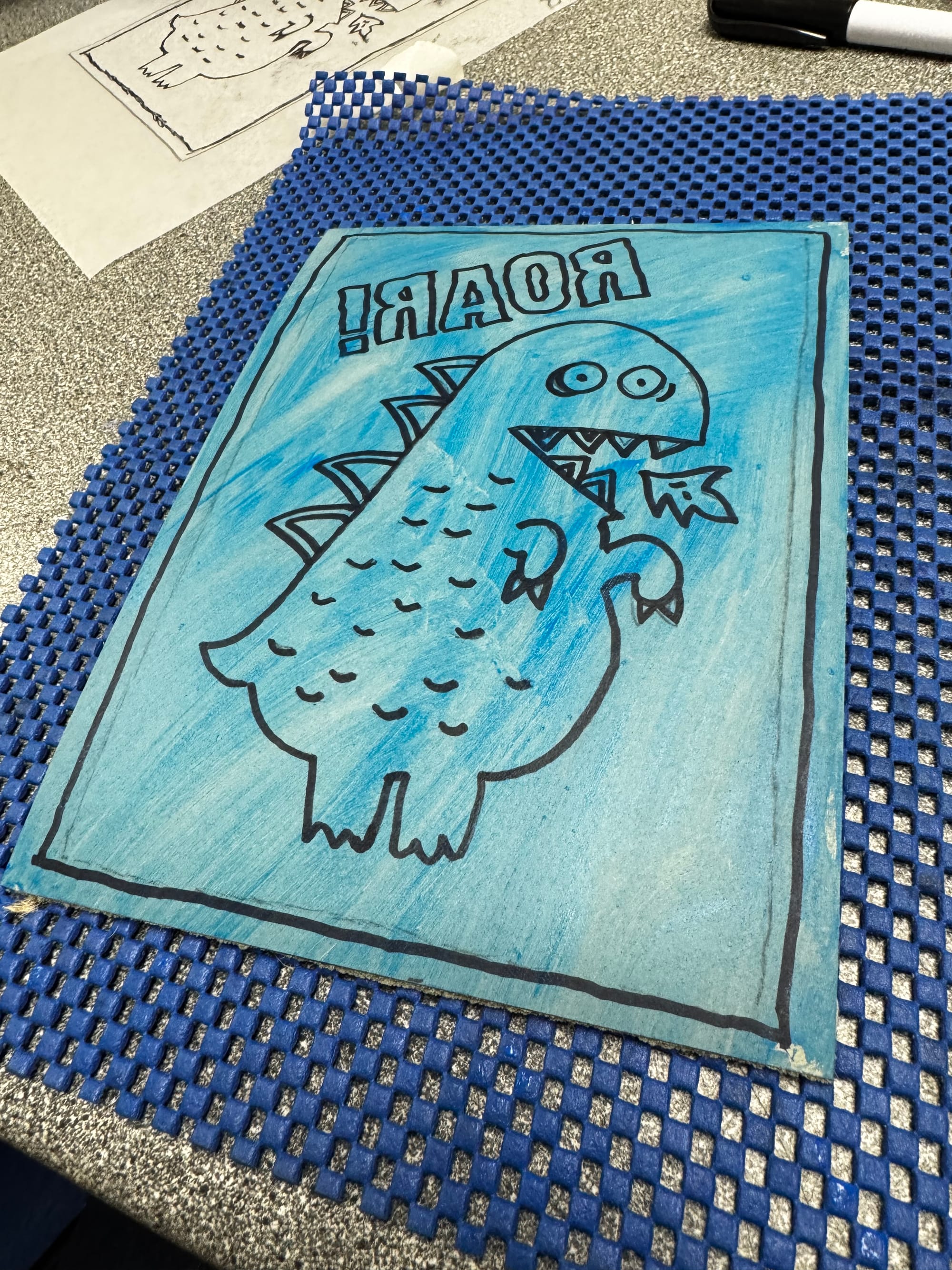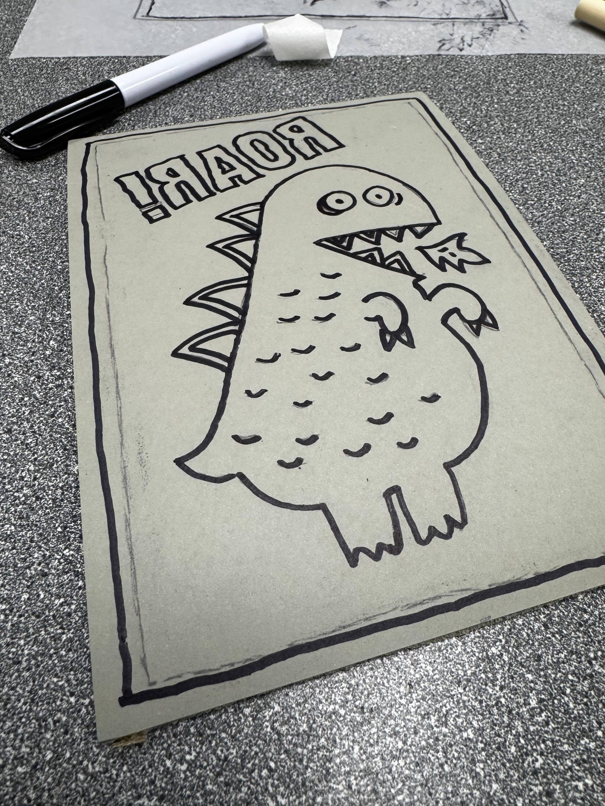 ...and printed him out for my next lesson, where he was traced and transferred onto a block of lino, adding a little Godzilla-inspired flame in the process...