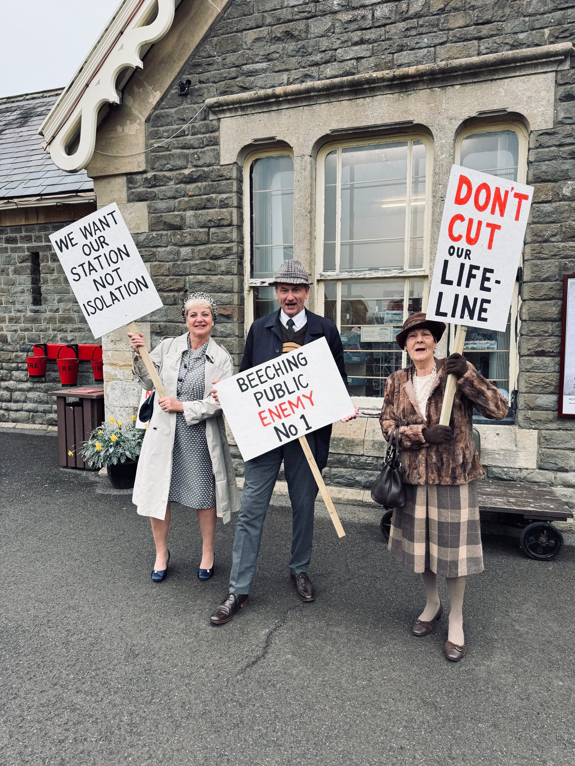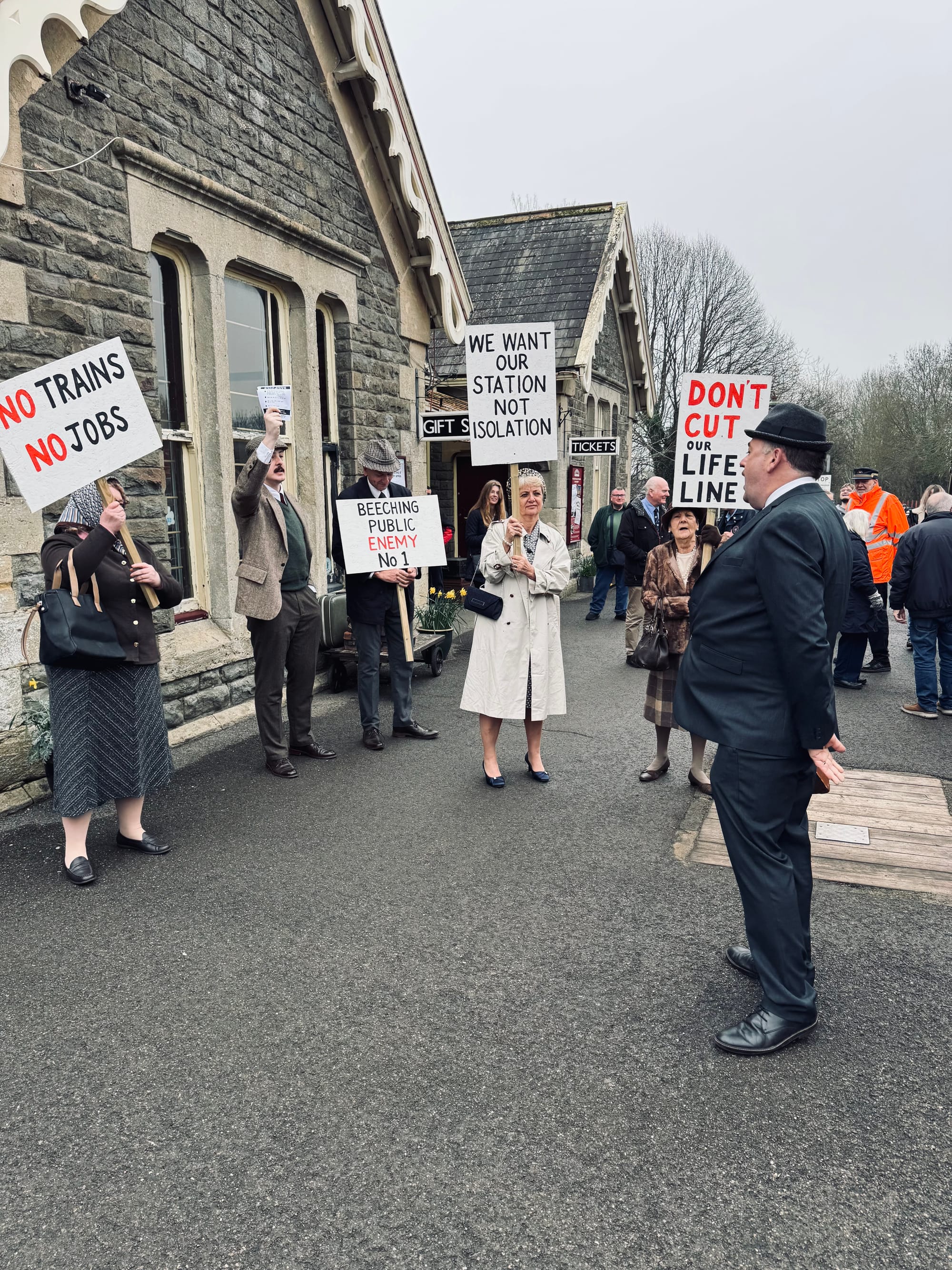 Operated today as a heritage attraction — complete with the all-important tea room situation inside a static 1950s carriage — Avon Valley Railway commemorated Bitton’s closure with a special day that saw members of local theatre group, the Kingswood Players, re-enact the protests that raged along the line in 1966… including an appearance by Dr. Beeching himself!